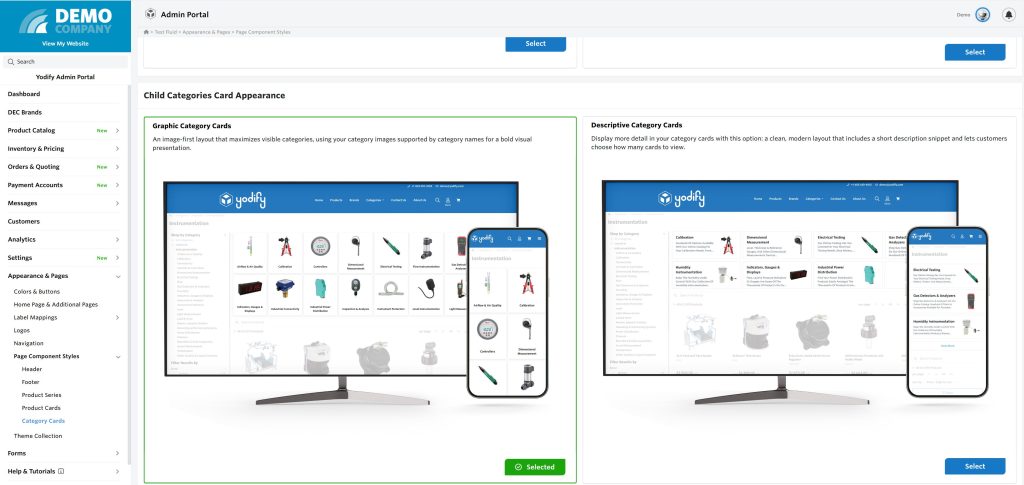 Choose your Category Card Style from your Yodify Admin Portal > Appearance & Pages > Page Component Styles > Category Cards