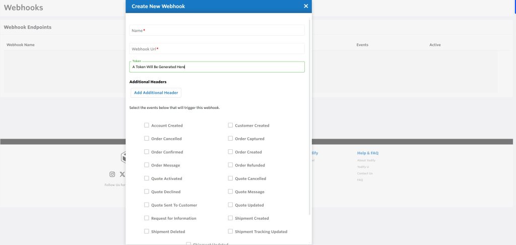You can configure a webhook URL in your system to receive real-time event notifications from Yodify—such as when an account is created, a quote is requested, or an order is placed. This setup enables seamless integration with your existing ERP or CRM systems, helping automate workflows and keep your data in sync.