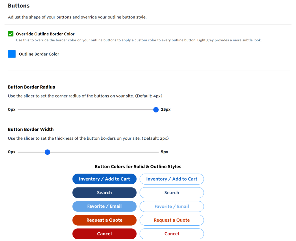 You can add another level of customization by changing your button and search input box. Adjust the shape of your buttons and override your outline button style. Choose your search border color, height, font size, and radius, all from your Admin Portal.