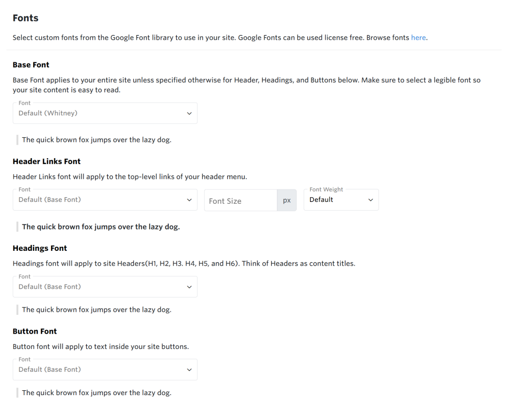 Yodify has added the ability to change your font site-wide using the Google Font Library. These fonts can be used license-free. Set your base font site-wide and adjust header links, headings, and button fonts as you see fit.